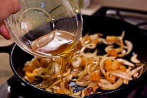 To the pan, add the onions and let them cook until they start to soften. Then add the apricots only (reserve the booze) and let the apricots caramelize a bit.