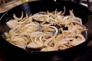 - Return skillet to medium-low heat and add the butter and onions. Gently saute onions for 5 minutes. Make sure they do not burn. Add the dried apricots (try not to add the brandy just yet) and saute another minute. Turn heat to medium-high and pour in the brandy that the apricots were soaked in. Let simmer for 1 minute.